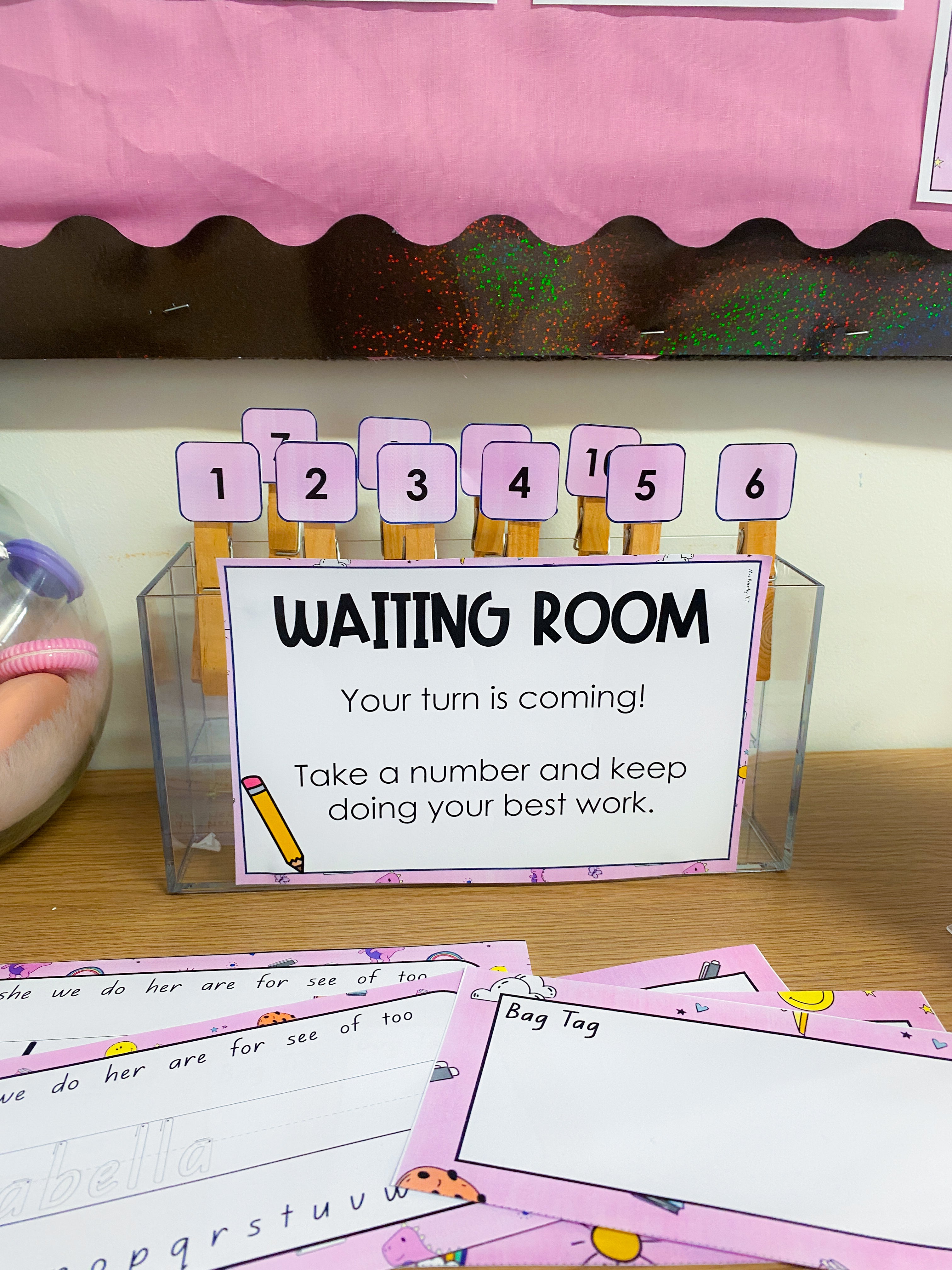 This comes with a waiting room cover template and then number cards to attach to pegs to clip onto students books in order.