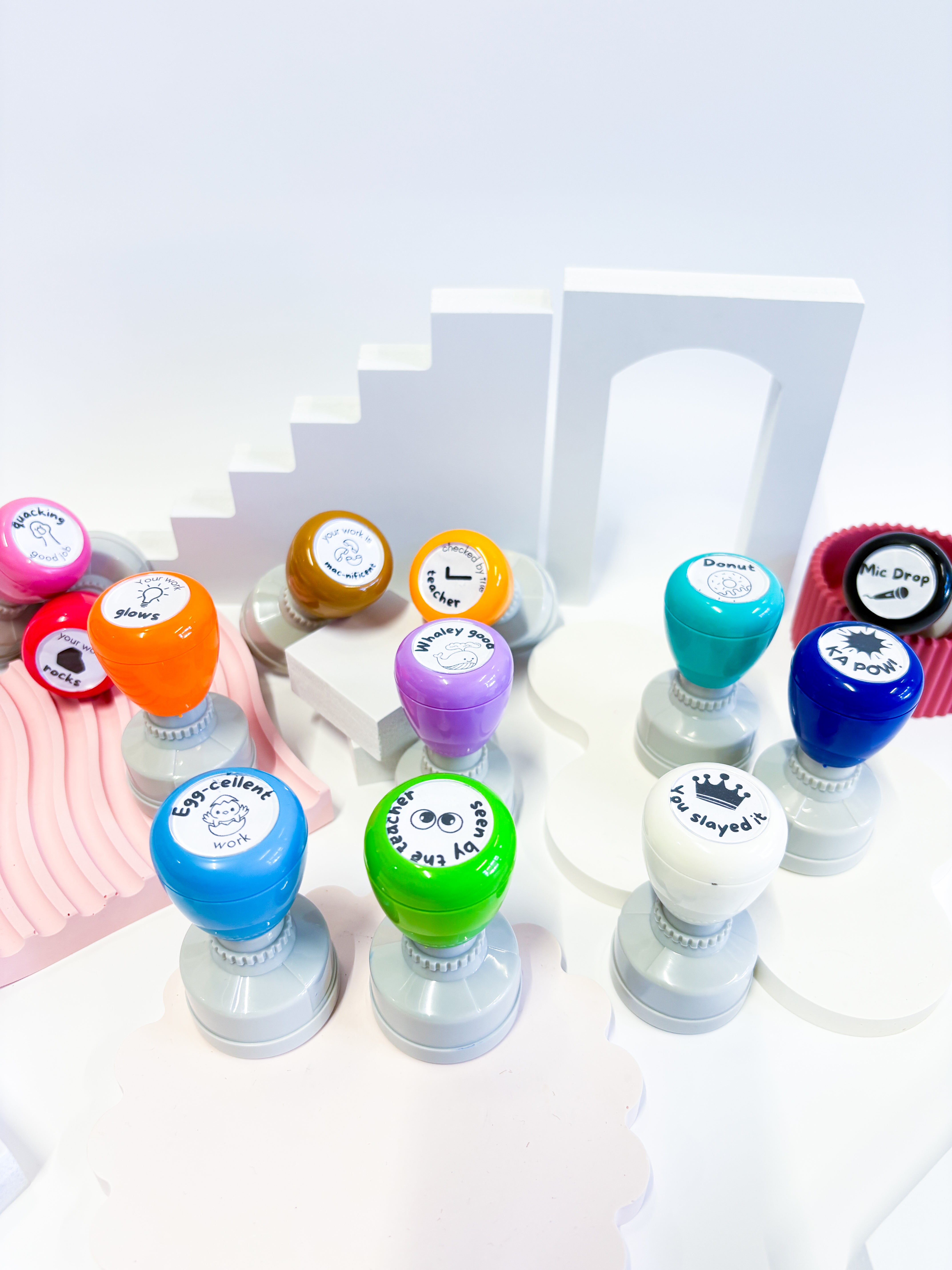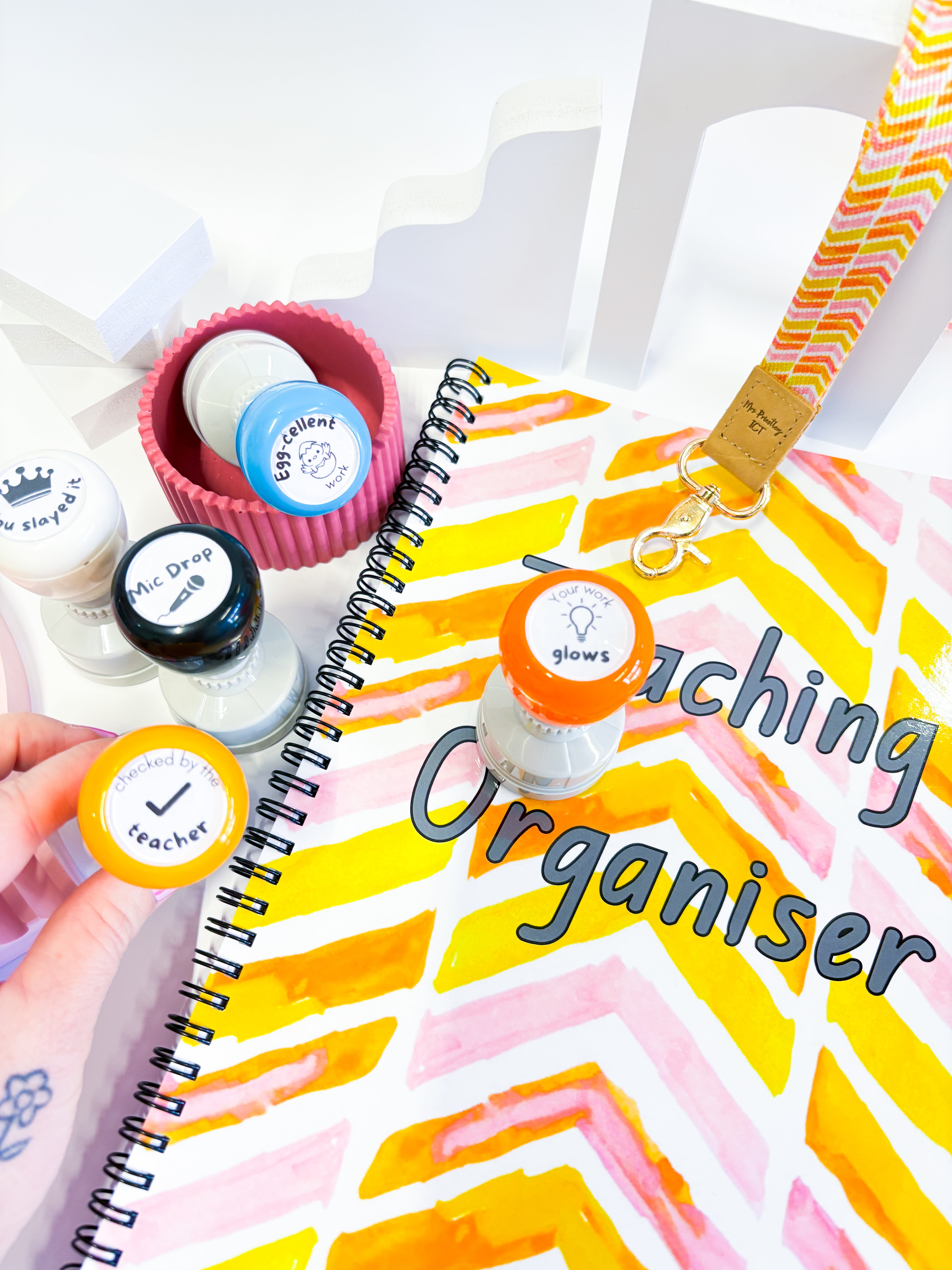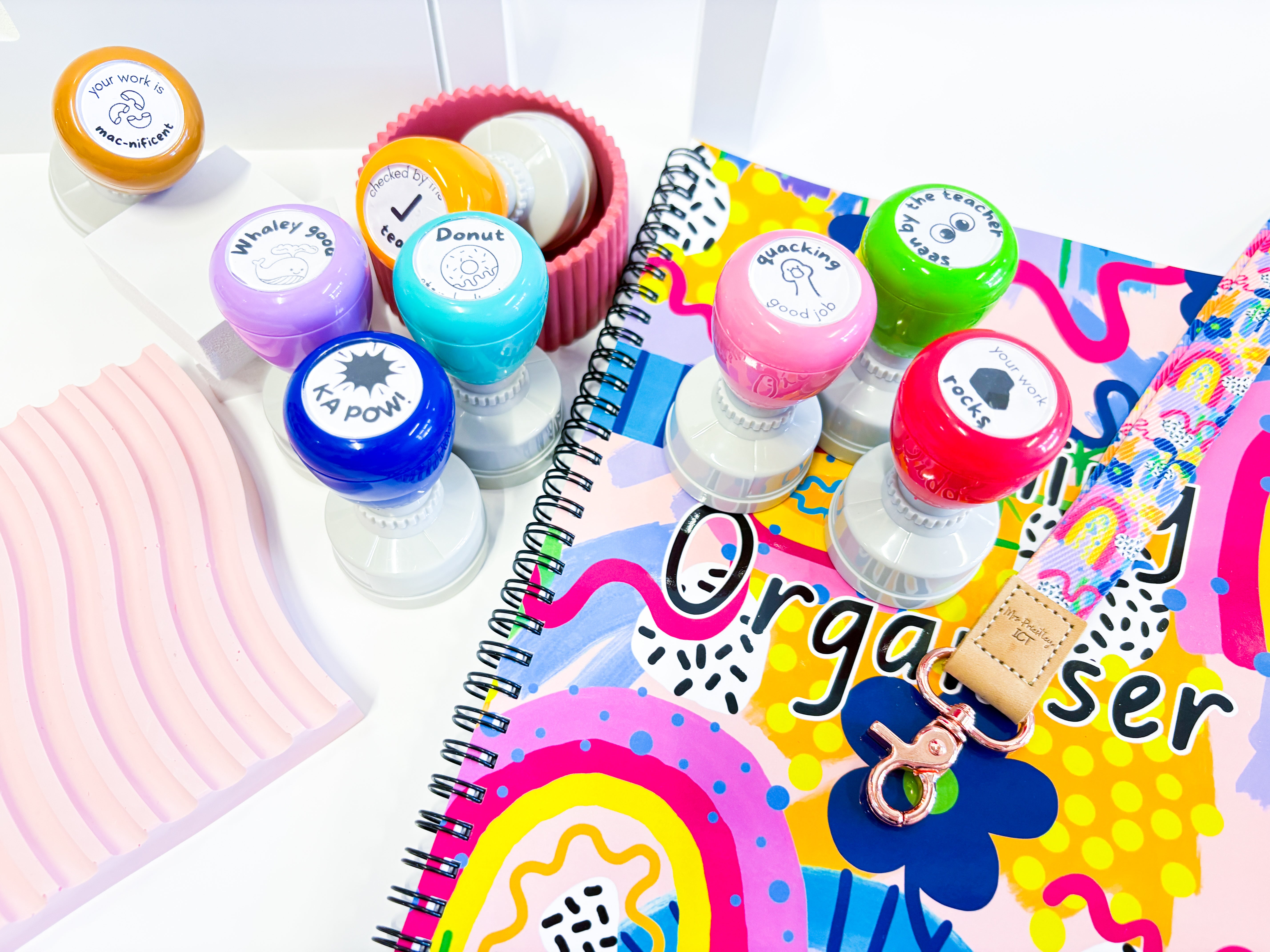 A unique set of stamps featuring the Mrs P ICT pattern symbols for your collection. Twelve unique designs with teacher feedback to add excitement and sparkle when it comes to providing feedback on student work. These feature a combination of Mrs P ICT icon designs, plush doodle drawings and fun teacher puns!