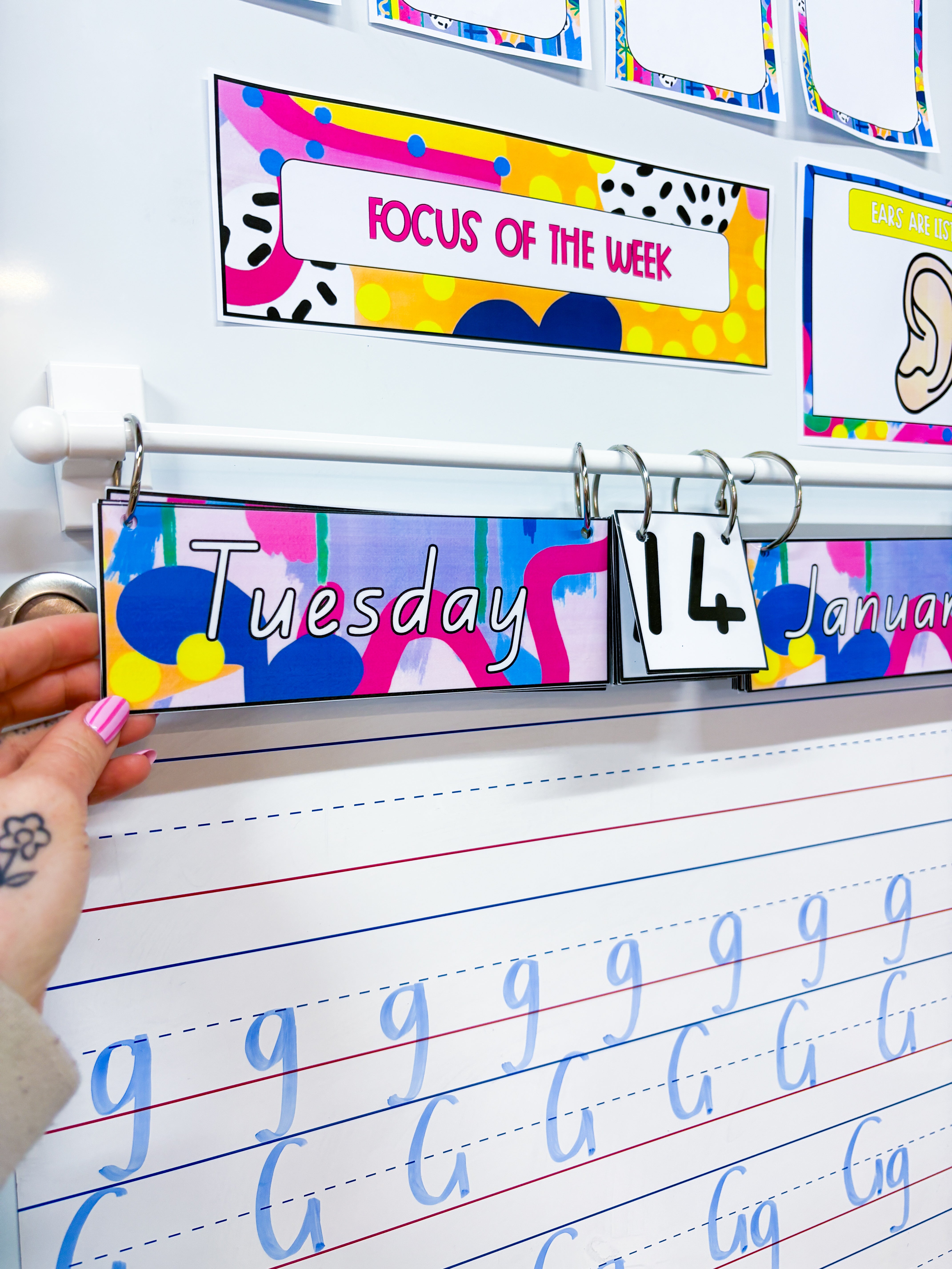 Add on an English or Te Reo Maori calendar laminated and printed for your classroom; or both in your chosen colour palette. I typically use the large size calendar. These come in two sizes: